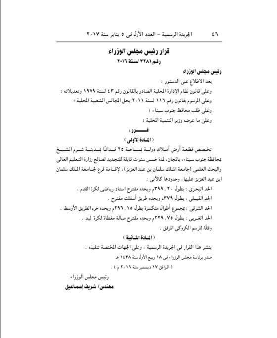 برغم كل مايثار عن مدى الخلافات بين الحكومة المصرية والحكومة السعودية ، إلا أنه وكعادة العقلاء ، و إستكمالا للصداقة المعهودة ، و في سياق الضربات الإستباقية التي تشنها الصقور على جحور الثعابين ، أصدر السيد رئيس مجلس الوزراء اليوم القرار رقم 3281 لسنة 2016 بتخصيص خمسة وعشرون فداناً بمد ينة شرم الشيخ بمحافظة جنوب سيناء لصالح وزارة التعليم العالي ولمدة خمسة سنوات بالمجان قابلة للتجديد ، لإنشاء فرع لجامعة الملك سلمان بن عبد العزيز .