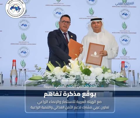 ضمن جهود الاتحاد لتعزيز التعاون في مجالات البحث العلمي والتطوير الزراعي، ودعم الأمن الغذائي العربي والتنمية المستدامة، وقع اتحاد مجالس البحث العلمي العربية مذكرة تفاهم مع الهيئة العربية للاستثمار والإنماء الزراعي.