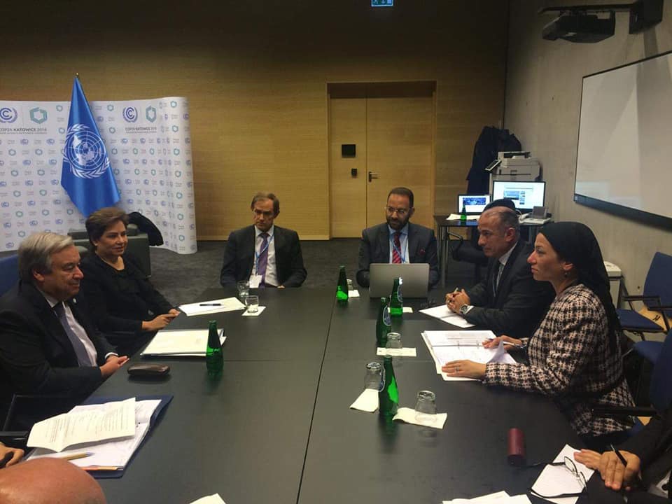 اجتمع الأمين العام للأمم المتحدة انطونيو جوتيريش مع الدكتوره ياسمين فواد وزيرة البيئة ورئيس الوفد المصرى التفاوضى لمؤتمر تغير المناخ 24 والتي ترأس حالياً مؤتمر الأمم المتحدة للتنوع البيولوجي، وذلك علي هامش مؤتمر المناخ المنعقد حالياً في بولندا وذلك في إطار الاهتمام الأممي بقضيه تغير المناخ وسير المفاوضات.