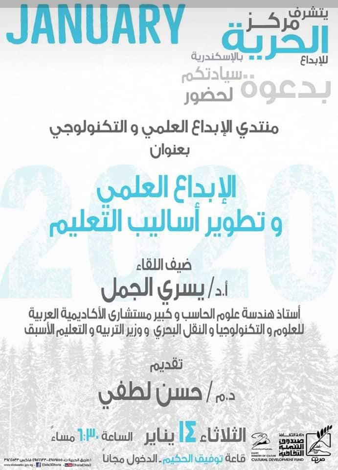 أقيمت امس بقصر الإبداع ندوة بعنوان الإبداع العلمي وتطوير التعليم أدارها الدكتور حسن لطفي وحاضرها الأستاذ الدكتور يسري الجمل الوزير السابق للتربية و التعليم وأستاذ الحاسب الآلي بالأكاديمية العربية للنقل البحري وتحدث فيها احدث أساليب للتعليم والتقنيات الحديثة وحضر الندوة لفيف من المهتمين بالبحث العلمي وكوارد التربية والتعليموبعض قيادات المجتمع المدني كما حضرها المهندس السيد حسن رئيس لجنة المشروعات وعضو مجلس نقابة المهندسين بالإسكندرية برئاسة المهندس احمد العمري