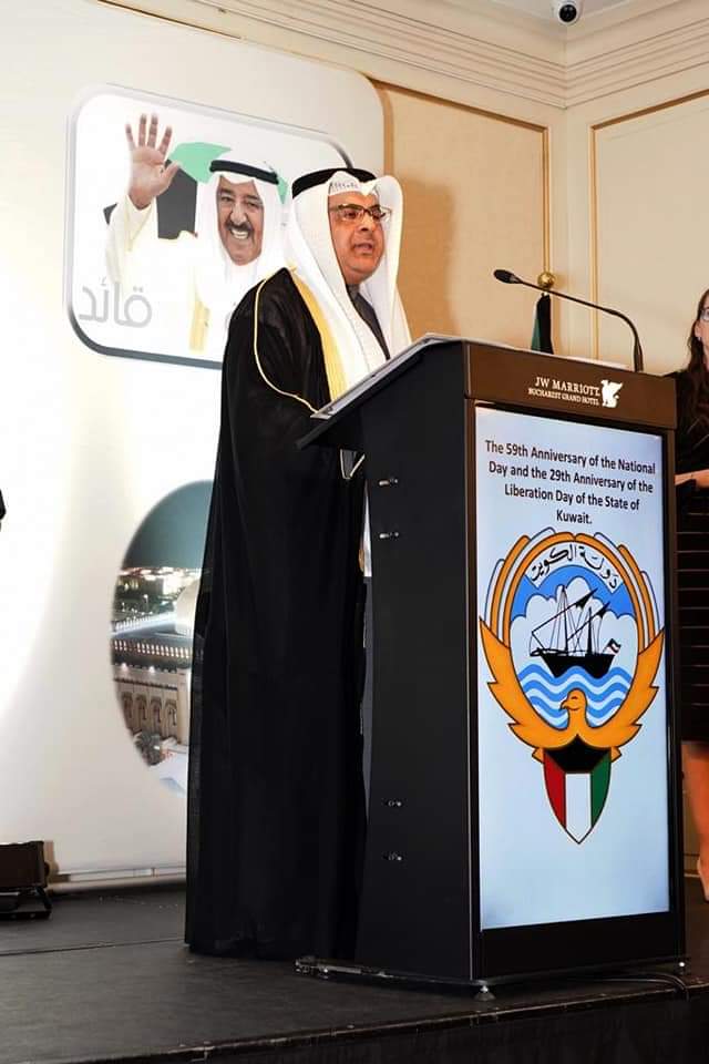 وتقدم سعادة السفير طلال الهاجرى سفير دولة الكويت برومانيا بكلمه حيث رفع أسمى التهاني والتبريكات إلى مقام حضرة صاحب السمو أميرالبلاد الشيخ صباح الاحمد الجابر الصباح حفظه الله ورعاه وسمو ولي العهد بتلك المناسبة العظيمة