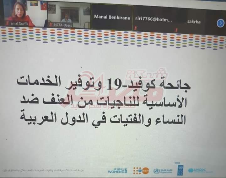 شارك المجلس القومي للمرأة فى ورشة العمل الإقليمية حول جائحة فيروس كورونا المستجد كوفيد-19 وتوفير الخدمات الأساسية للناجيات من العنف ضد النساء والفتيات في الدول العربية ، وذلك بدعوة من هيئة الأمم المتحدة للمرأة ، ومنظمة الصحة العالمية ، وبرنامج الأمم المتحدة الإنمائي ، ومكتب الأمم المتحدة المعني بالمخدرات والجريمة ، وصندوق الأمم المتحدة للسكان في منطقة الدول العربية ، وذلك عبر تطبيق زووم.