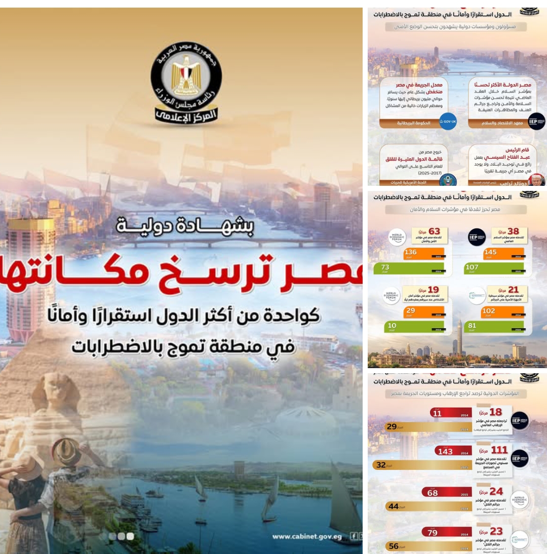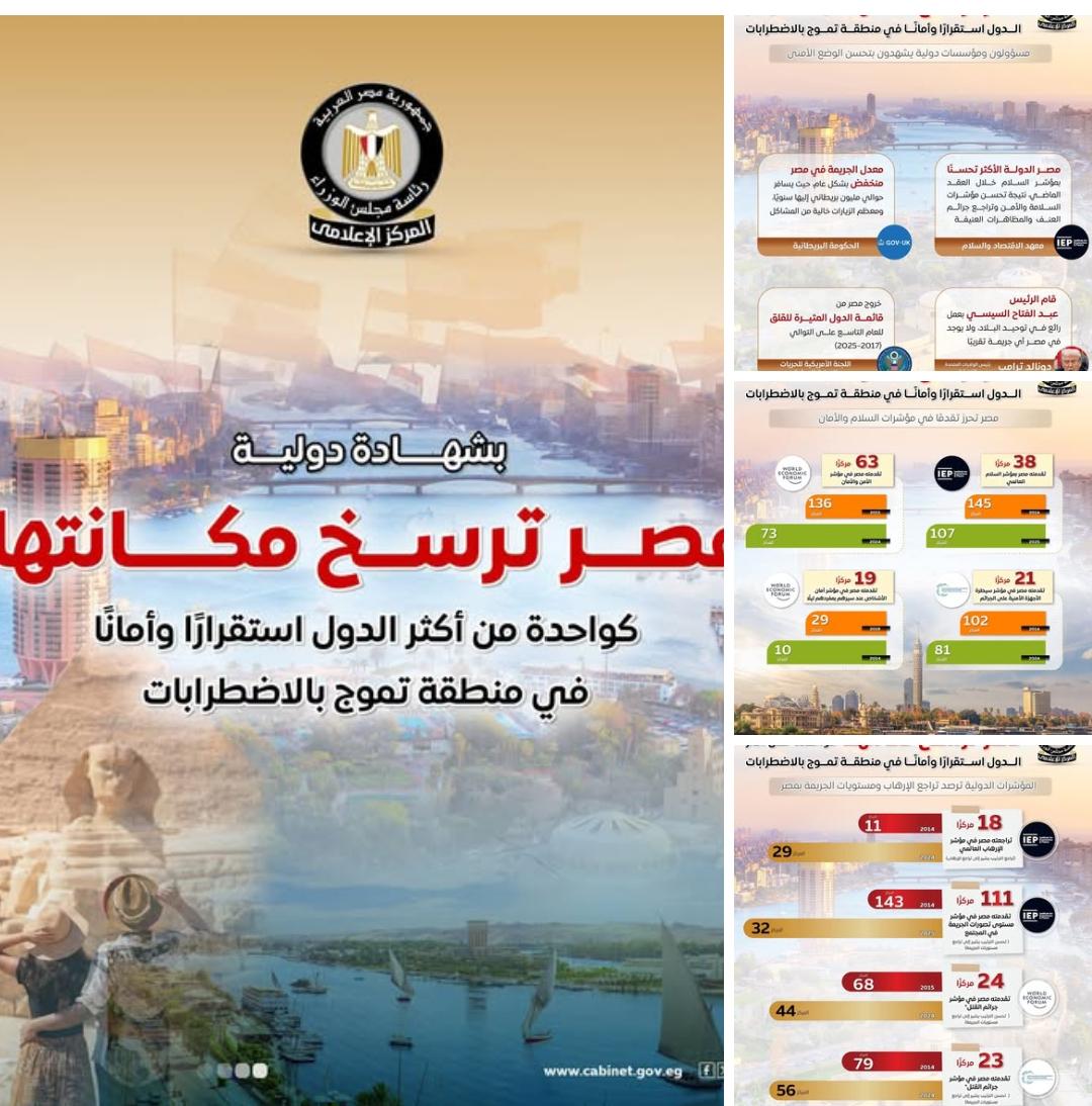 نشر المركز الإعلامي لمجلس الوزراء عددًا من الإنفوجرافات عبر منصاته على مواقع التواصل الاجتماعي، سلط من خلالها الضوء على الشهادة الدولية التي تؤكد مكانة مصر كواحدة من أكثر الدول استقرارًا وأمانًا في منطقة تموج بالاضطرابات.