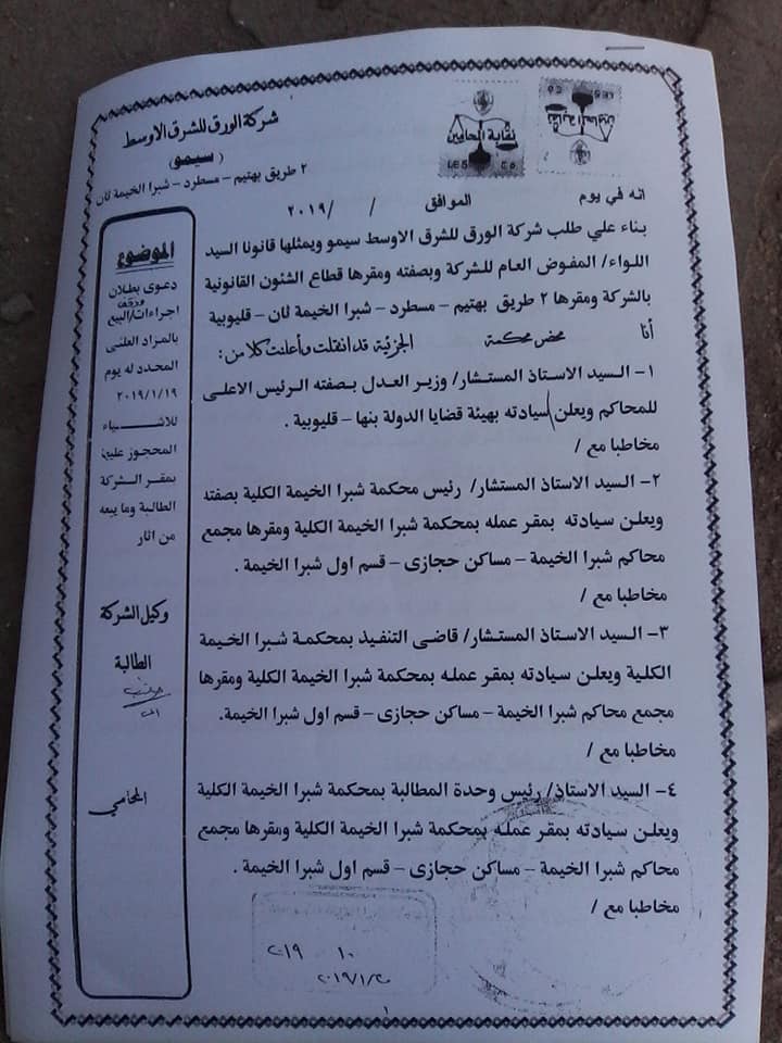 وحينها اقام العمال واللجنة العليا برفع قضية علي المستثمر وقام المستثمر برفع 5 قضايا ولكن القضاء انتصر للعمال ومصلحة البلاد وحكمت لصالح العمال في 15/3/2014 وقد