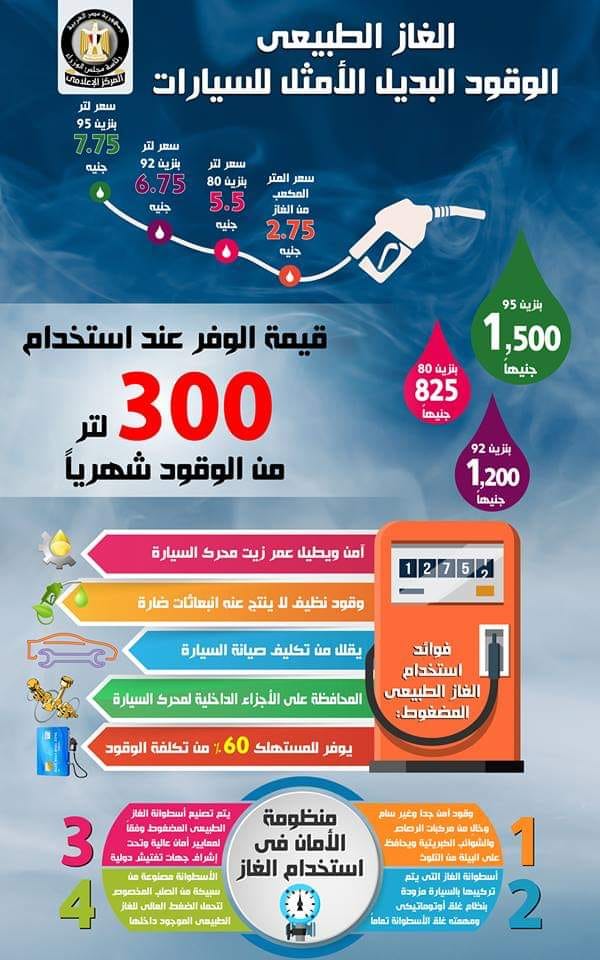 نشر المركز الإعلامي لمجلس الوزراء, إنفوجراف عن أهمية وفوائد الاعتماد على الغاز الطبيعي باعتباره الوقود البديل الأمثل للسيارات, وأوضح المركز الإعلامي أن فائدة استخدام الغاز الطبيعي تكمن في أنه بديل آمن ويطيل عمر زيت محرك السيارة, كما أنه يوفر للمستهلك 60% من تكلفة الوقود, ويحافظ على الأجزاء الداخلية لمحرك السيارة, إلى جانب كونه وقود نظيف لا ينتج عنه انبعاثات ضارة, فضلاً عن أنه يقلل من تكليف صيانة السيارة.