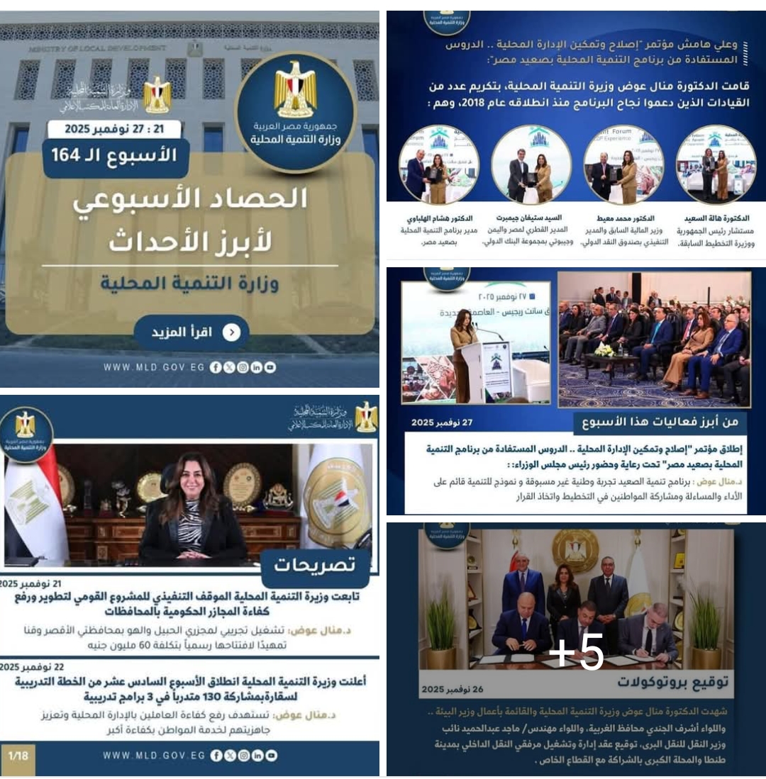 - أكدت الدكتورة منال عوض أن برنامج التنمية المحلية بصعيد مصر أصبح نموذجًا يحتذى به وطنيًا ودوليًا.