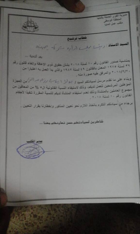 وقام احمد عبيد بتسليم للمقبولين بالوظائف ،اليوم، بالمركز الشامل فى حضور محمد حسين خلف رئيس مجلس الادارة و امال ربيع سكرتير عام الجمعيه والمدير التنفيذى ؛ليأتي ذلك لتطبيق للقانون رقم 10 لسنه 2018.