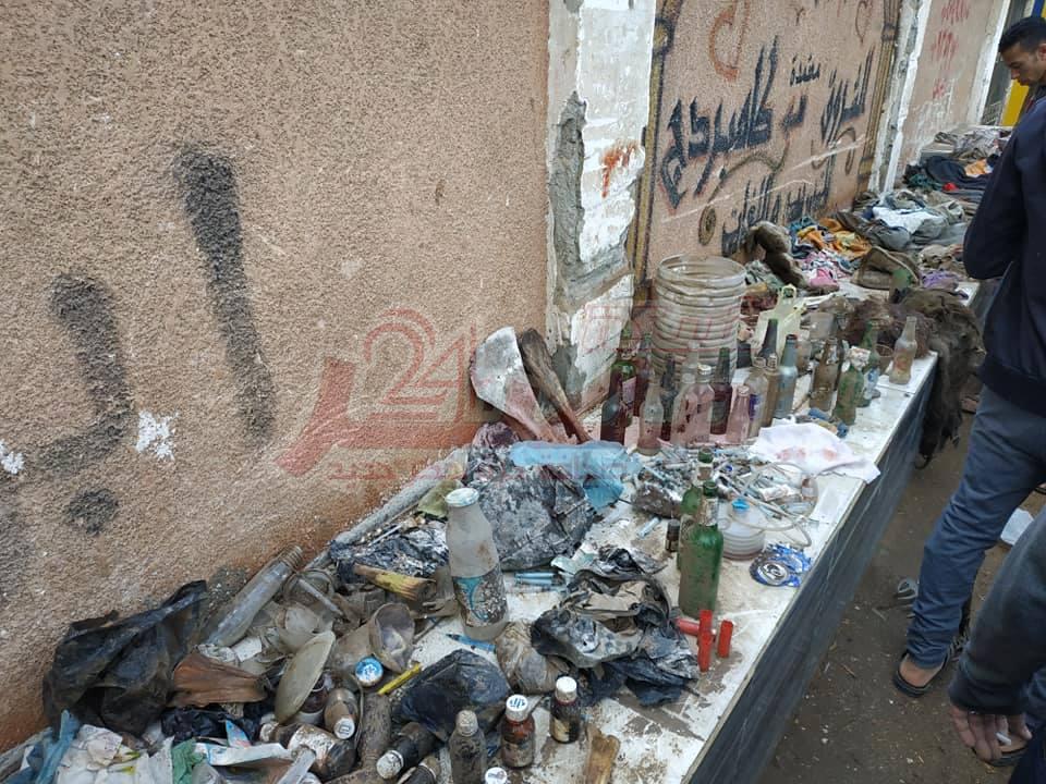 طلق خرطوش , كمية كبيره من الملابس المستعمله والمستخدمة لمن يستخدمون اسطح المقابر للفسق والفجور وتجارة المخدرات