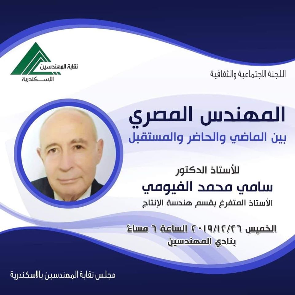 تحت رعاية الاستاذ الدكتور هشام سعودي نقيب مهندسي الإسكندرية تقيم اللجنة الإجتماعية والثقافية بنقابة المهندسين بالإسكندرية برئاسة المهندس احمد الغمري ندوة من خارج الصندوق بعنوان المهندس المصري بين الماضي والحاضر والمستقبل يحاضرها الأستاذ الدكتور سامي محمد الفيومي الأستاذ المتفرع قسم الانتاج بهندسة الاسكندرية وذلك يوم الخميس ٢٦ ديسمبر في تمام الساعة السادسة بنادي المهندسين بسابا باشا