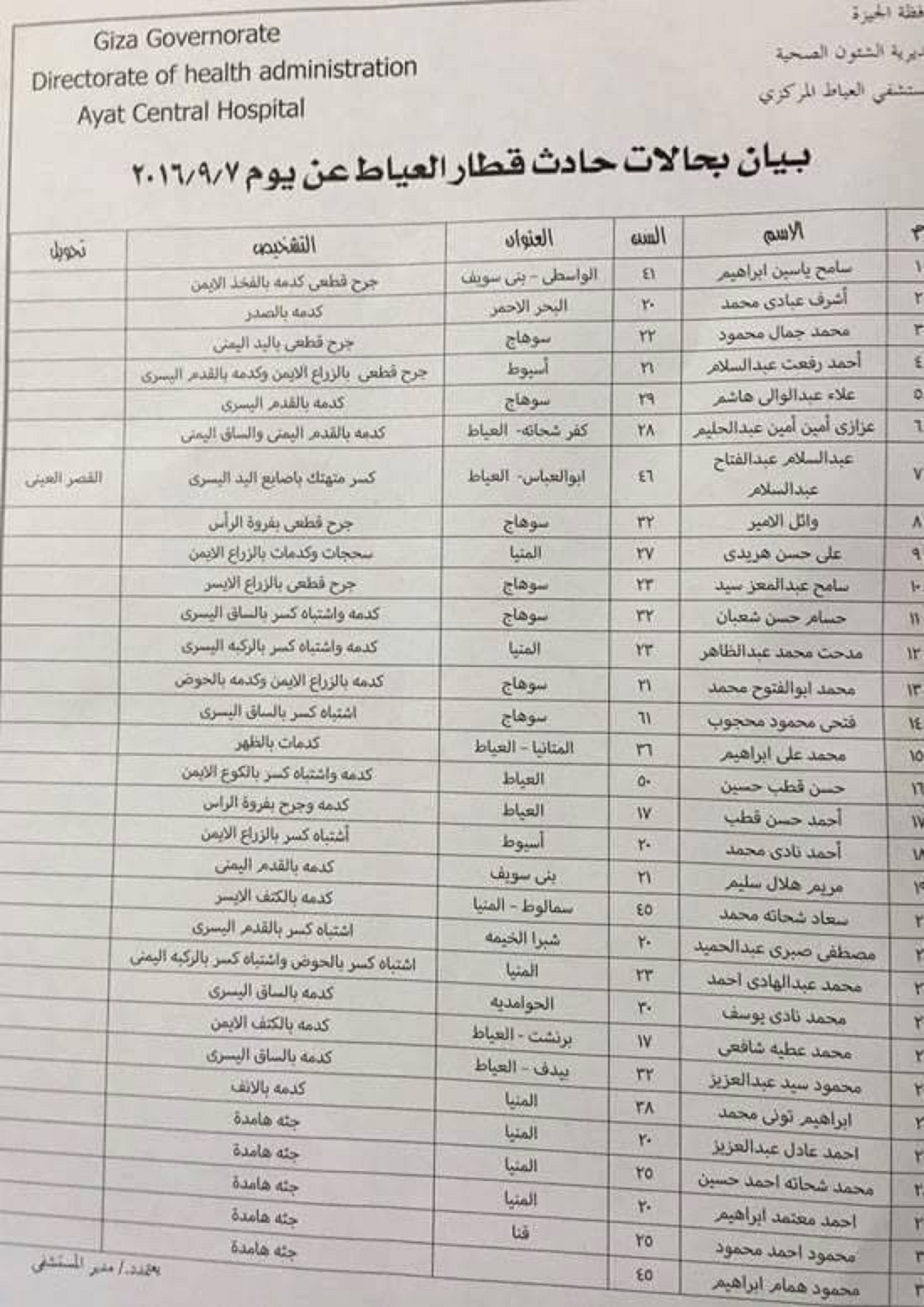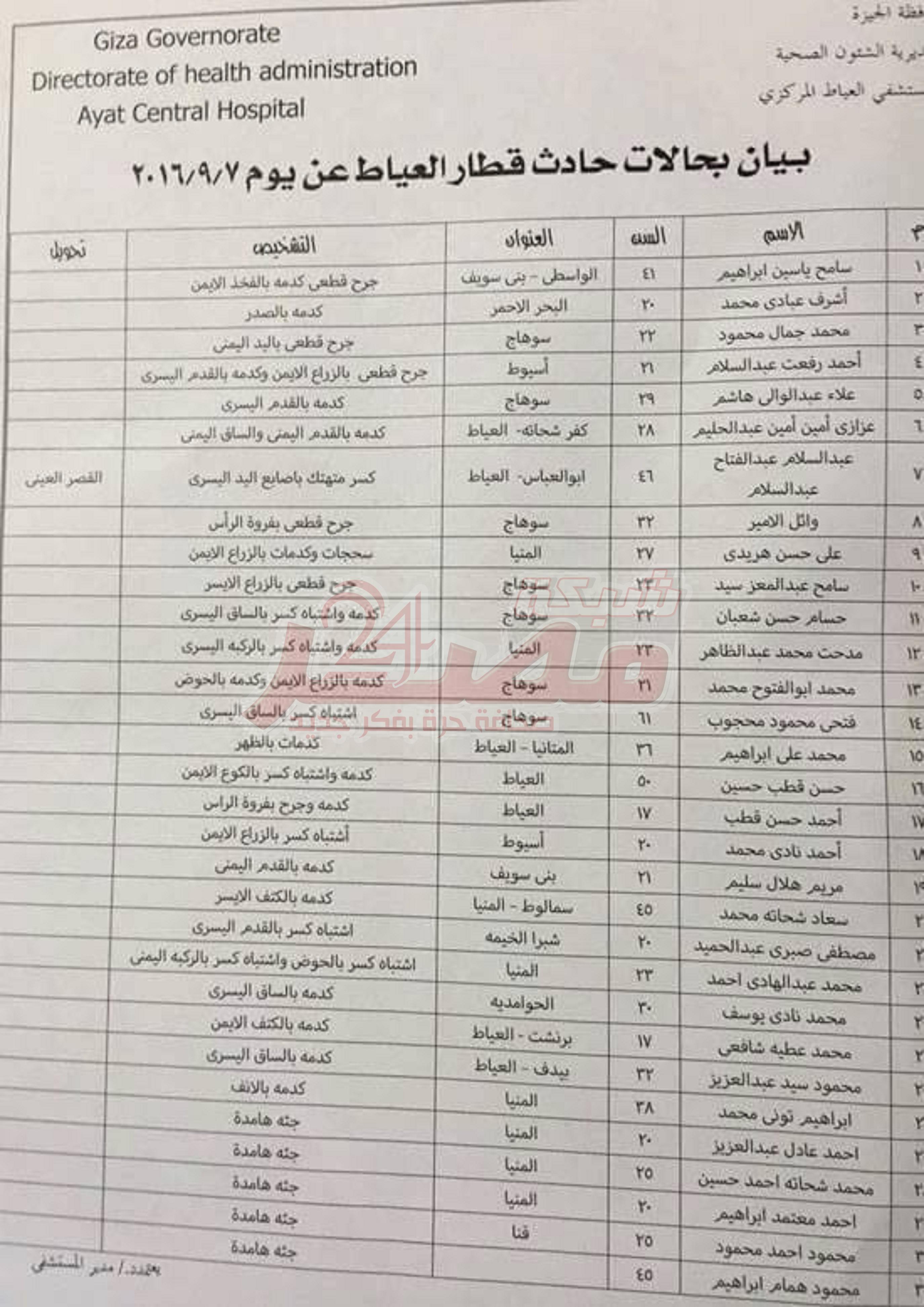 أصدرت مستشفى العياط اليوم، بيان بأسماء مصابي و وفيات حادث قطار العياط، و أسفر الحادث عن 26 مصاب، و 5 وفيات.