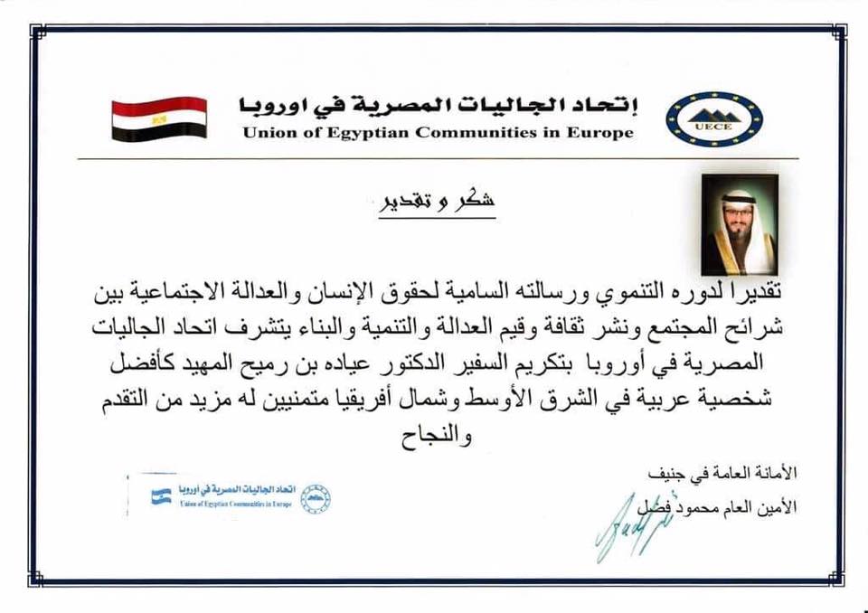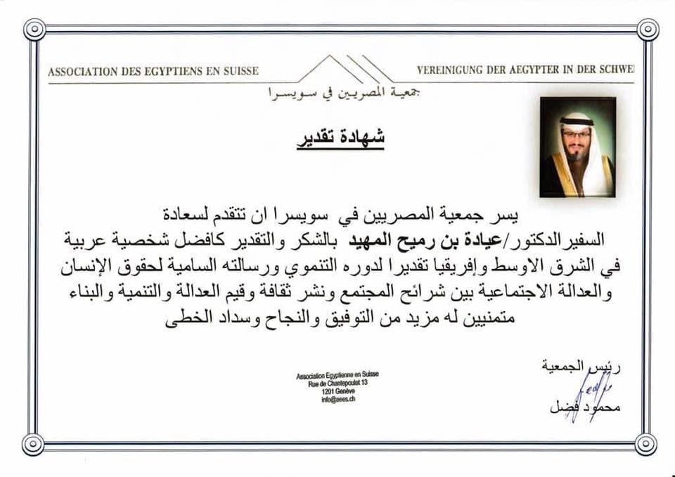 تقديرا لدوره التنموي ورسالته السامية لحقوق الإنسان والعدالة الاجتماعية بين شرائح المجتمع والعمل علي نشر وسطية الدين الإسلامي وكل الرسالات السماويةونبذ العنف ومحاربة الفكر المتطرف وان الإسلام رسالة سلام ومحبة بين الشعوب ولأنه صاحب بصمة في مجتمعه السعودي والعربي ونموذج يحتذي به كاصاحب رسالة وفكر مستنير جاء هذا التكريم لسعادة الدكتور السفير عيادة بن رميح المهيد من إتحاد الجاليات المصرية في أوربا ذلك الكيان العربي في الإتحاد الأوربي ومقره في جنيف بسويسرا والذي يضم اكثر من مليوني عضوا ويشكل كيان مجتمعي قوي وداعم للفكر المستنيروكذلك جمعية المصريين في سويسرا برئاسة السيد محمود فضل والأمين العام لاتحاد الجاليات في اوربا ذلك الكيانات الداعمةلاصحاب البصمات والقدرات الفاعلة لتنمية الانسان ونبذ العنف والطائفية والعنصرية
