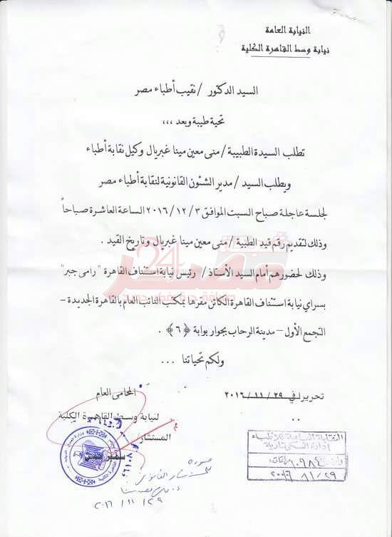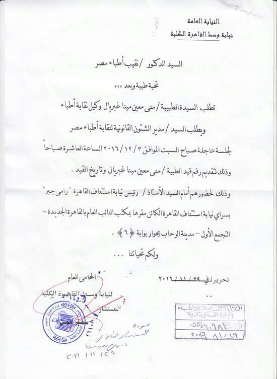 بعد ما أثارته تصريحاتها المثيرة للجدل بشأن قرار وزارة الصحة بإستخدام السرنجة الواحدة لأكثر من مريض ، و التي أصابت الشارع المصري بحالة من الغليان و التخبط ، قامت النيابة العامة بوسط القاهرة اليوم بمخاطبة السيد الدكتور نقيب الأطباء ، بإخطاره بوجوب مثول المدعوة د.منى مينا وكيل النقابة ، و السيد مدير الشؤون القانونية ، و ذلك لحضور جلسة عاجلة صباح السبت الموافق 3/12/2016 بسراي نيابة إستئناف القاهرة بالتجمع الأول .