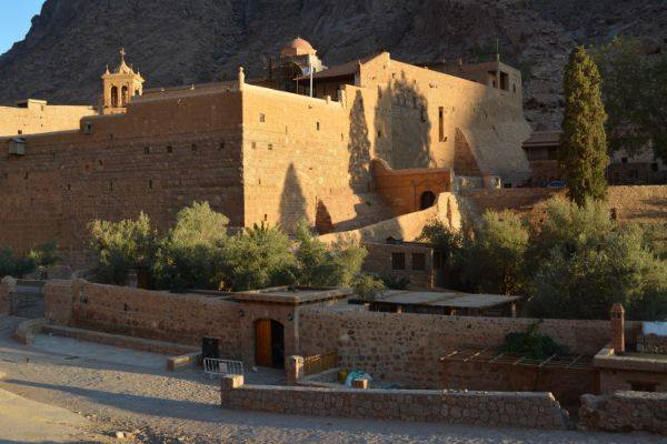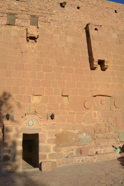 أكد خبير الآثار الدكتور عبد الرحيم ريحان مدير عام البحوث والدراسات الأثرية والنشر العلمى بمناطق آثار جنوب سيناء أن الجدار الشمالى الغربى يضم ثلاث بوابات من بوابات الدير الأربعة الأصلية والبوابة الرئيسية يعلوها نفيس وعقد عاتق ونقش يونانى نصه ( هذه بوابة الرب يدخل منها الصالحون) تحته اسم الإمبراطور جستنيان ويعود هذا النص لعصر الإنشاء فى القرن السادس الميلادى وقد تم إغلاق هذه البوابة بكتل الجرانيت فى العصور الوسطى والبوابة عرضها 2م وارتفاعها متر واحد وهناك مدخل مقبى استعمل كمدخل ثانى شمال البوابة الرئيسية وسمك السور عند هذه النقطة 1.65م واستمر استعمال هذا المدخل بعد غلق البوابة الرئيسية ثم أغلق فى وقت غير معلوم.