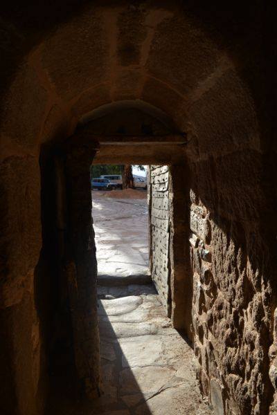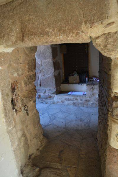 ويشير الدكتور ريحان إلى مدخل سرى منذ القرن السادس الميلادى وقت إنشاء الدير عبره بنفسه من الحديقة إلى الدير حيث كان يتم الدخول إلى الدير عن طريق نفق تحت الأرض يؤدى إلى الحديقة وفى نهاية القرن التاسع عشر الميلادى فتحت البوابة التى مازالت مستعملة حتى الآن عرضها متر واحد وارتفاعها 1.5م والتى تؤدى إلى ممر ضيق وثلاثة أبواب متتالية من الخشب المصفح بالحديد ويعلو هذه البوابة نقشين، نقش عربى يحكى قصة تأسيس الدير والآخر يونانى ويعلو هذه البوابة مشكولى وتؤدى هذه البوابة إلى ممر منكسر يفضى إلى بهو يؤدى إلى منشئات الدير المختلفة