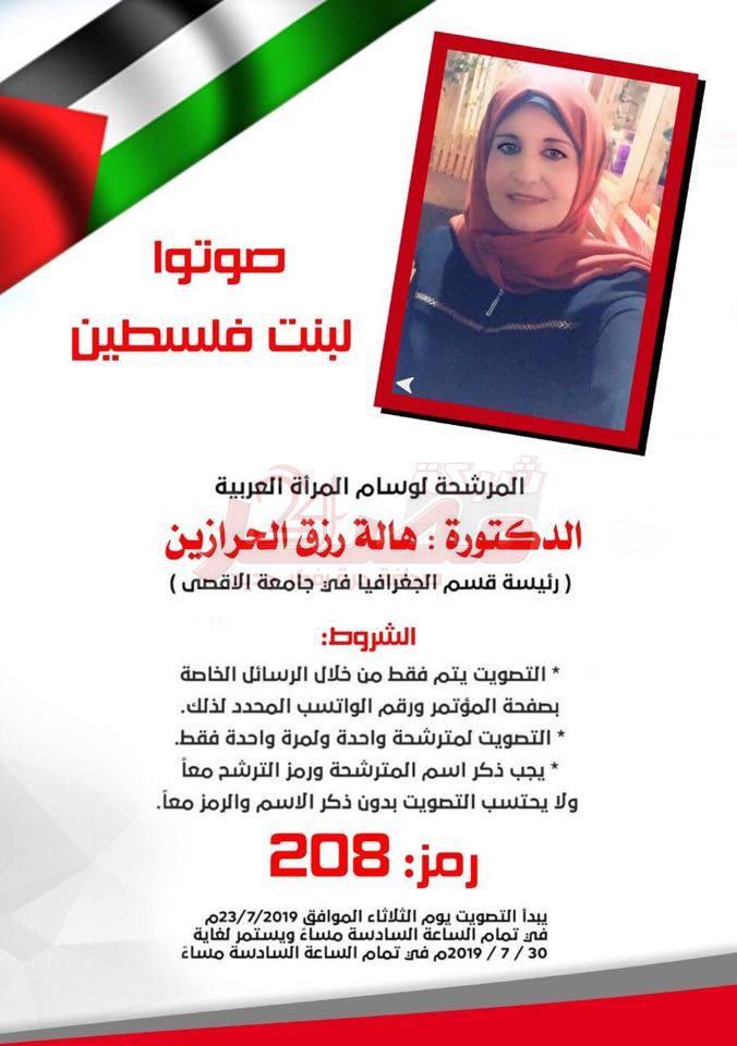 وقد دعت الاكاديمية الفلسطينية أبناء شعبها الى دعمها بكتابة اسمها هالة رزق الحرازين رقم 208 .