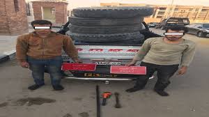 عقب تقنين الإجراءات تم ضبطهما حال إستقلالهما السيارة رقم (د ن ع 3685) وبداخلها 2 لوحة حمراء من الكرتون تحمل أرقام (37625) نقل غربية.. وبحوزتهما (4 إطار سيارة- 3 مفتاح لفك الإطارات).