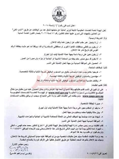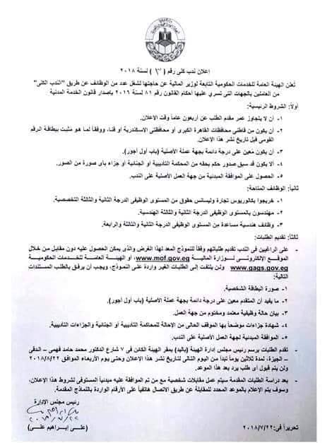 وزارة المالية تفتح باب الندب للموظفين بوزارة التربية والتعليم والوزارات الأخرى للعمل لدى وزارة المالية بالهيئة العامة للخدمات الحكومية - طلب التقديم حتى 22 / 8 / 2018 .