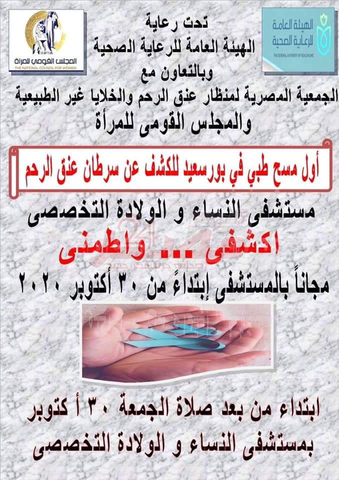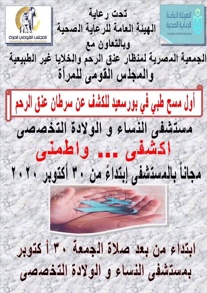 صرحت نجلاء ادوار مقرر المجلس القومي للمرأة ببورسعيد ان المجلس يدعو سيدات بورسعيد للكشف و الاطمئنان حيث تُعلن مستشفى النساء والولادة التخصصي عن بدء تفعيل بروتوكول التعاون بتقديم مسحات الكشف المبكر عن سرطان عنق الرحم مجاناً بالمستشفى إبتداءً من ٣٠ أكتوبر ٢٠٢٠، والتى تشمل أخذ العينة وتحليلها وذلك باستخدام أحدث جهاز Colposcope (ميكروسكوب عنق رحم) تحت إشراف أساتذة متخصصة وذلك للفئات التالية: