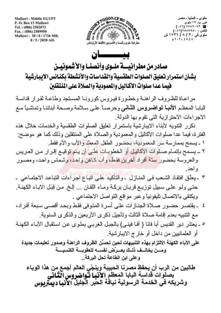استمرار تعليق الصلوات الطقسية والقداسات والأنشطة بكنائس الايبارشية فيما عدا صلوات الاكاليل والمعمودية والصلاة على المنتقلين مراعاة للظروف الراهنة وخطورة فيروس كورونا المستجد،