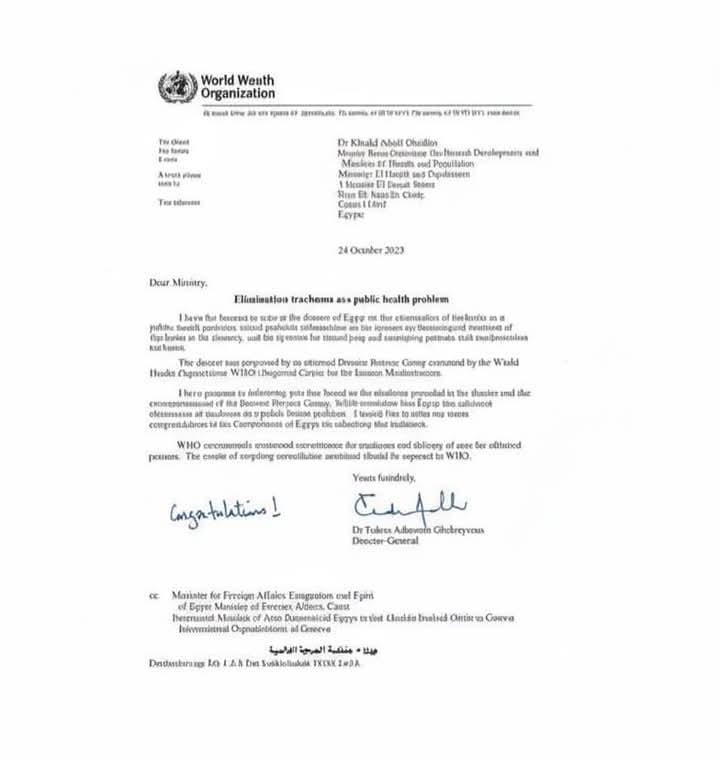 أعلن الدكتور تيدروس أدهانوم غيبرييسوس، المدير العام لمنظمة الصحة العالمية، عبر كلمة مسجلة، خلو جمهورية مصر العربية -رسميًّا- من مرض «التراكوما» كمشكلة صحية عامة.