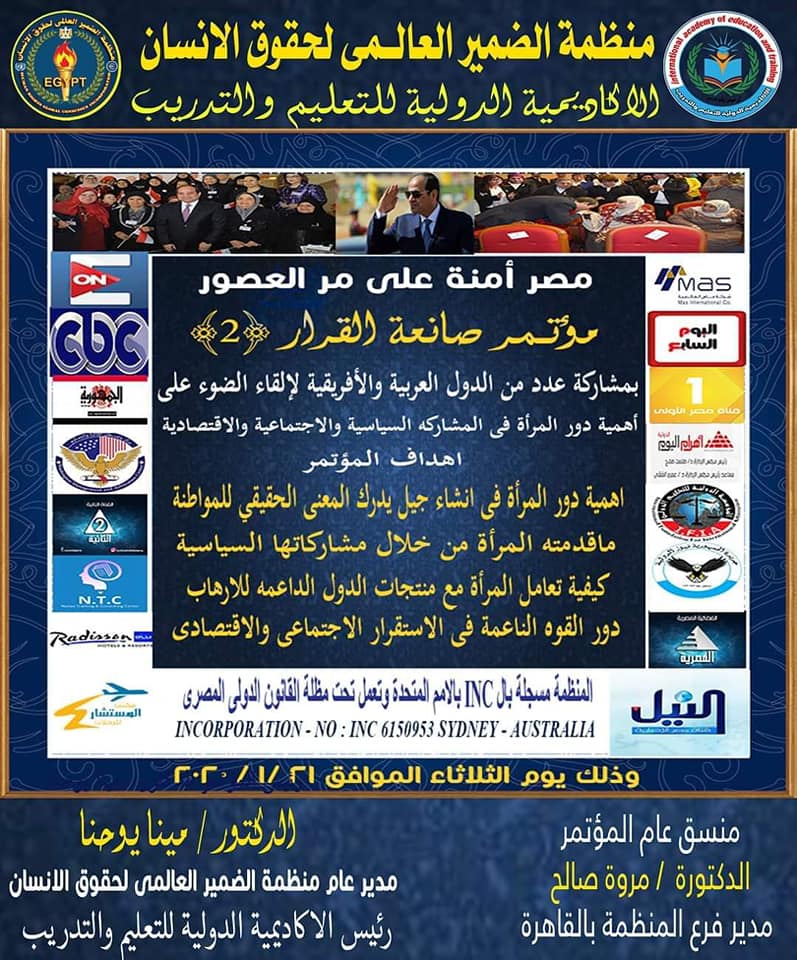 ينظم الدكتور مينا يوحنا مدير عام منظمة الضمير العالمى لحقوق الإنسان مؤتمر " صانعة القرار " في نسخته الثانية بمشاركة عدد من الدول العربية والإفريقية لإلقاء الضوء على أهمية دور المرأة في المشاركة السياسية والاجتماعية والاقتصادية.