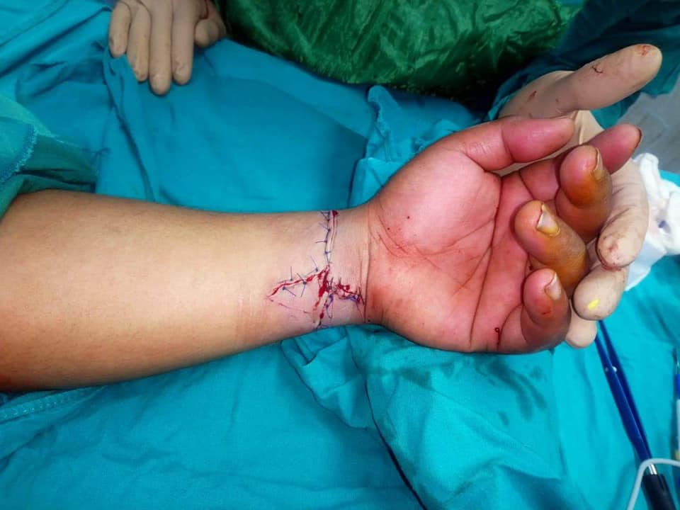 حيث حضر المصاب البالغ من العمر ٢٠ عاما الي قسم اﻹستقبال والطوارئ بالمستسفي يعاني من جرح قطعي عميق بالجانب الأمامي من الرسغ الأيسر تسبب في نزيف شديد نتيجة إصابة الأوعية الدموية المغذية لليد مع وجود قطع بالشريان الزندي وقطع بالعصب الزندي وقطع جزئي بالعصب اﻷوسط وقطع باﻷوتار القابضة لﻷصبعين الخاتم واﻷصغر والوتر القابض الزندي للرسغ .