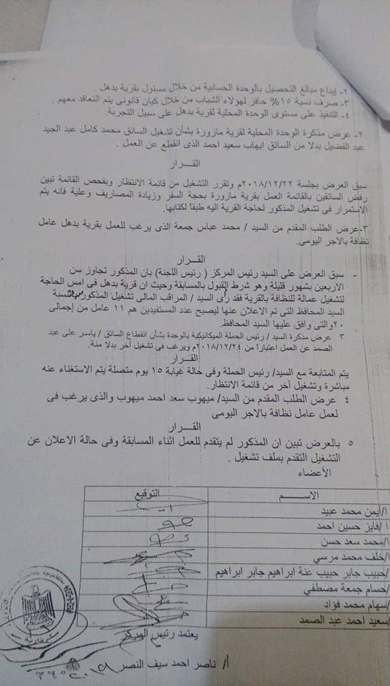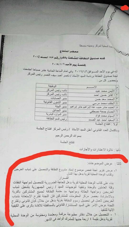 و بناءأ عليه نتقدم لمعاليكم بطلب الموافقة على اسناد التحصيل بمنظومة النظافة بالقرى التابعة لمركز ومدينة سمسطا وفقاً لما ورد بمحضر لجنة النظافة بالوحدة المحلية لمركز ومدينة سمسطا المؤرخ في 6/1/2019 فأن اللجنة تقترح الاستعانة بشباب الخريجين للعمل في تحصيل رسوم النظافة من خلال كيان قانونى على ان يتم صرف نسبة 15%حافز لهولاء الشباب من خلال كيان قانونى يتم التعاقد معهم