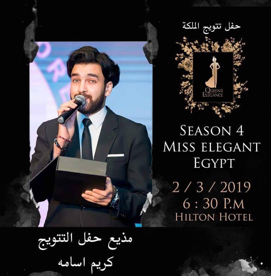 يقدم الإعلامى "كريم أسامة " حفل تتويج مسابقة ملكة جمال الاناقه لــ2019 بموسمه الرابع والمقرر إقامته يوم السبت الموافق 2 مارس فى فندق هيلتون رمسيس القاهرة